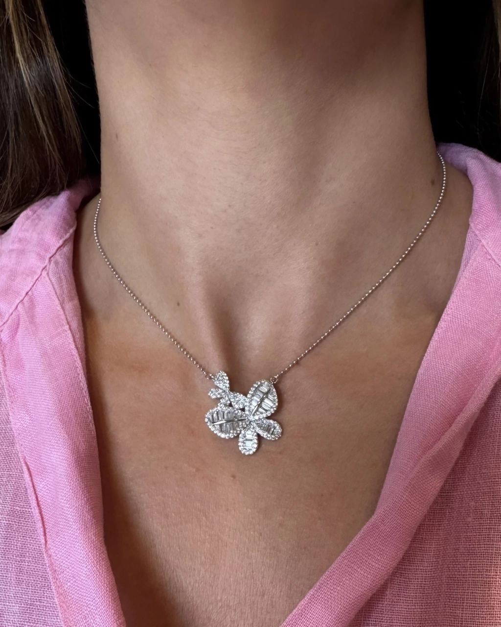 Colar Borboleta Cravação em Baguetes, joia em Prata 925, corrente em bolinhas, ajustes para 40cm, 42cm e 45cm, fecho lagosta. Peça atemporal e delicada. Garanta o seu!